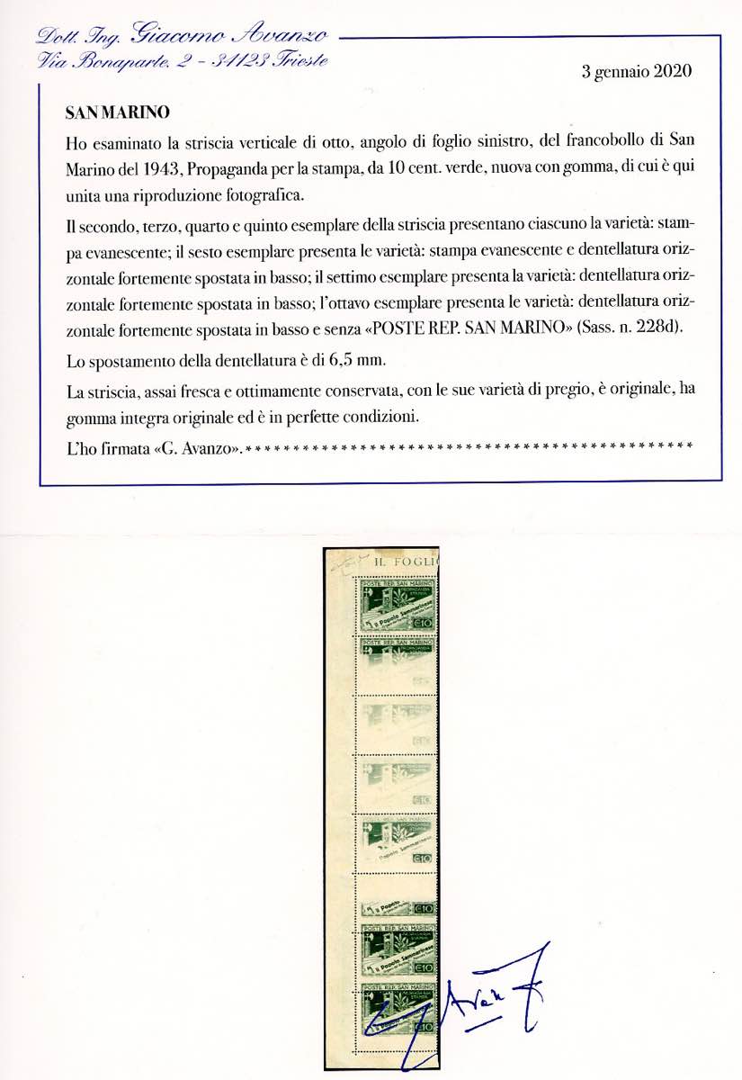 1943 - 10 cent. Propaganda per la stampa, striscia verticale di otto, quattro esemplari con stampa evanescente, tre con dentellatura orizzontale fortemente spostata in basso (228d), angolo di foglio, gomma originale integra, perfetta. Bella varietà, d'effetto. Cert. Raybaudi e Avanzo.