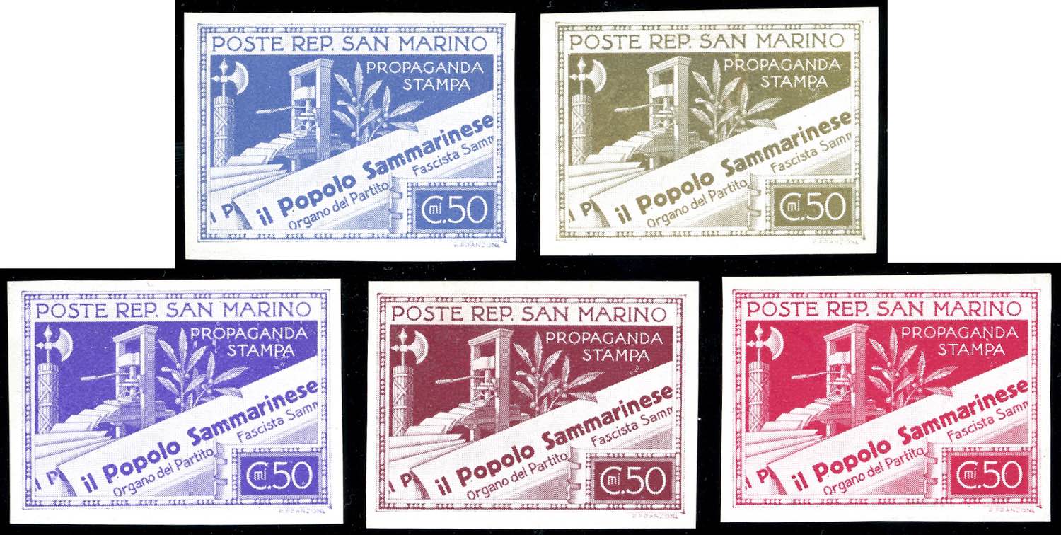 1943 - 50 cent. Propaganda per la stampa (232), cinque saggi in colori differenti, non dentellati, su carta senza filigrana, senza gomma ... Leggi tutto