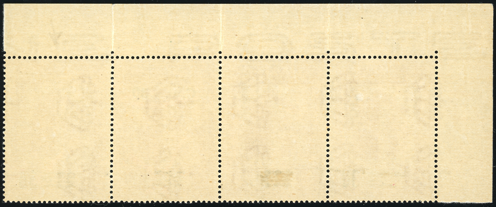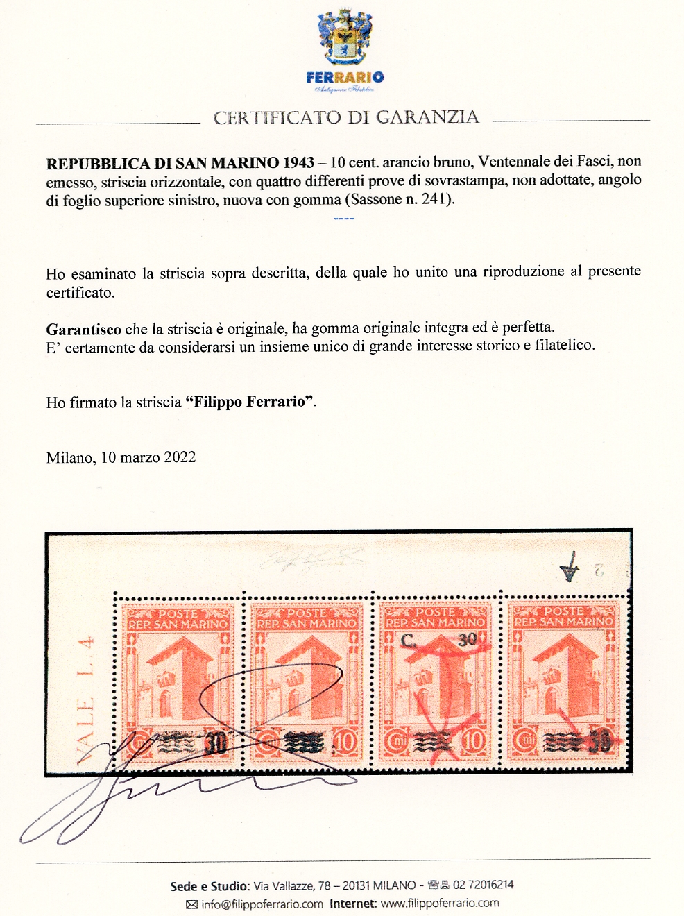 1943 - 10 cent. Ventennale dei Fasci, non emesso (241), striscia orizzontale con quattro diverse prove di soprastampa, eseguite dopo la ... Leggi tutto