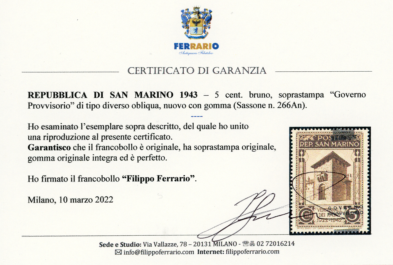 1943 - 5 cent. soprastampa "Governo Provvisorio" di tipo diverso obliqua (266An), gomma originale integra, perfetto. Cert. Ferrario.
