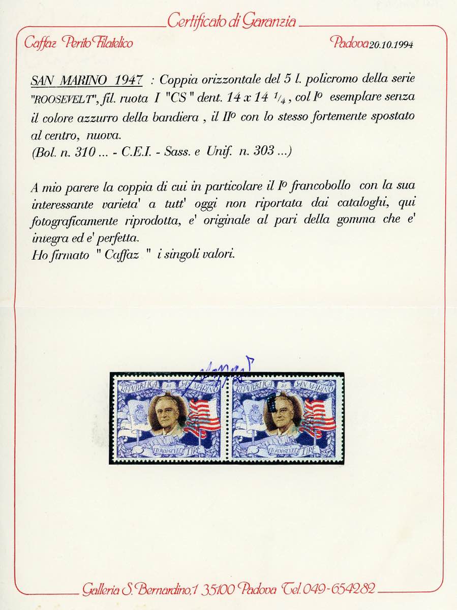1947 - 5 lire Roosvelt, coppia orizzontale, il primo esemplare senza la stampa dell'azzurro della bandiera, il secondo con la stampa dell'azzurro fortemente spostata (303kc,303kb), gomma integra, perfetta. Molto rara, pochi esemplari noti. Cert. Caffaz.