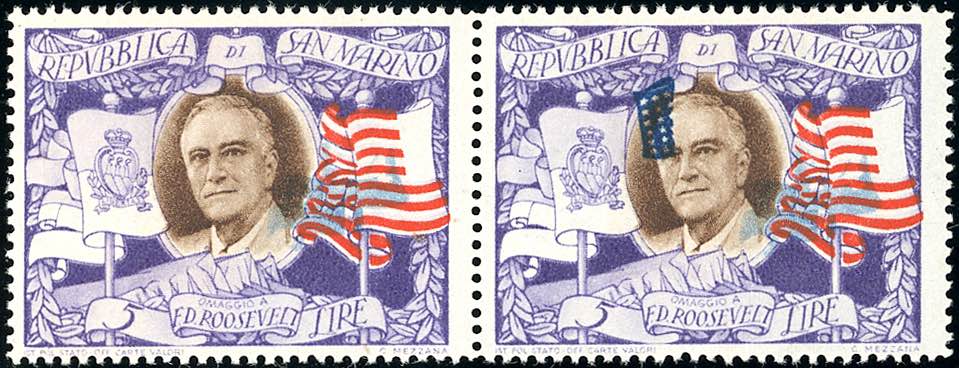 1947 - 5 lire Roosvelt, coppia orizzontale, il primo esemplare senza la stampa dell'azzurro della bandiera, il secondo con la stampa ... Leggi tutto