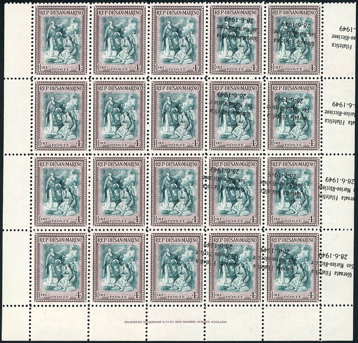 1949 - 4 lire Alberoniana, blocco di venti con soprastampa capovolta, obliqua e parziale "Giornata Filatelica San Marino - Riccione 28/6/1949" (314) di probabile origine privata. Insieme raro e non catalogato.