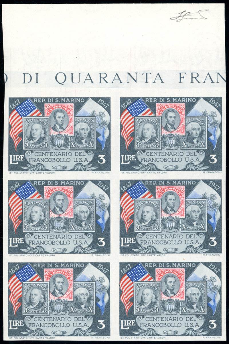 1947 - 3 lire Centenario francobollo Stati Uniti, non dentellato (331b), blocco di sei, bordo di foglio, gomma integra, perfetto. Bello. Ferrario.