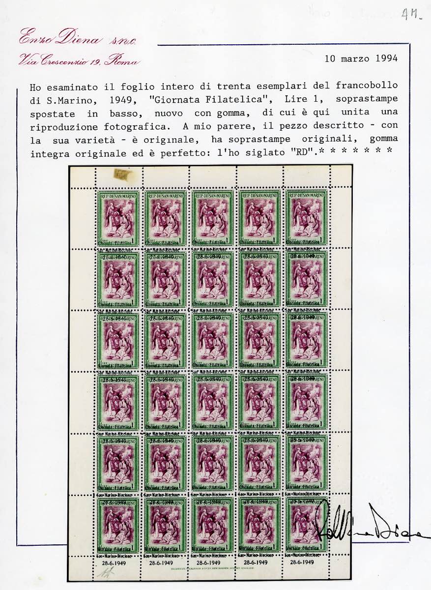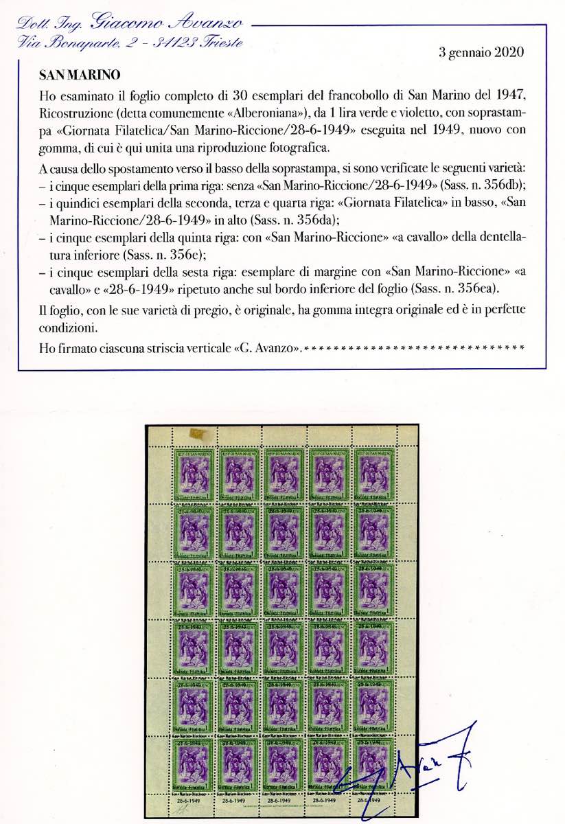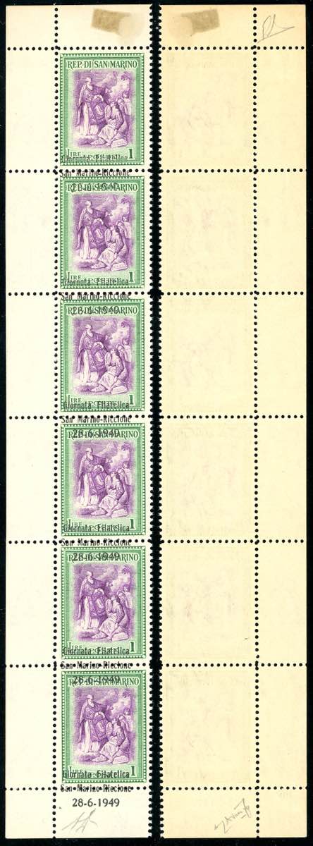1947 - 1 lira Giornata Filatelica, striscia verticale di sei, un esemplare senza soprastampa, tre con soprastampa fortemente spostata in basso, uno con soprastampa "a cavallo" e uno con la soprastampa ripetuta anche sul bordo inferiore del foglio (356db,356da,356e,356ea), angolo di foglio, gomma originale integra, perfetta. Cert. Avanzo ed E.Diena del foglio di provenienza.