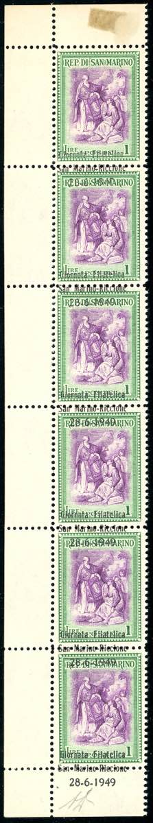 1947 - 1 lira Giornata Filatelica, striscia verticale di sei, un esemplare senza soprastampa, tre con soprastampa fortemente spostata in ... Leggi tutto