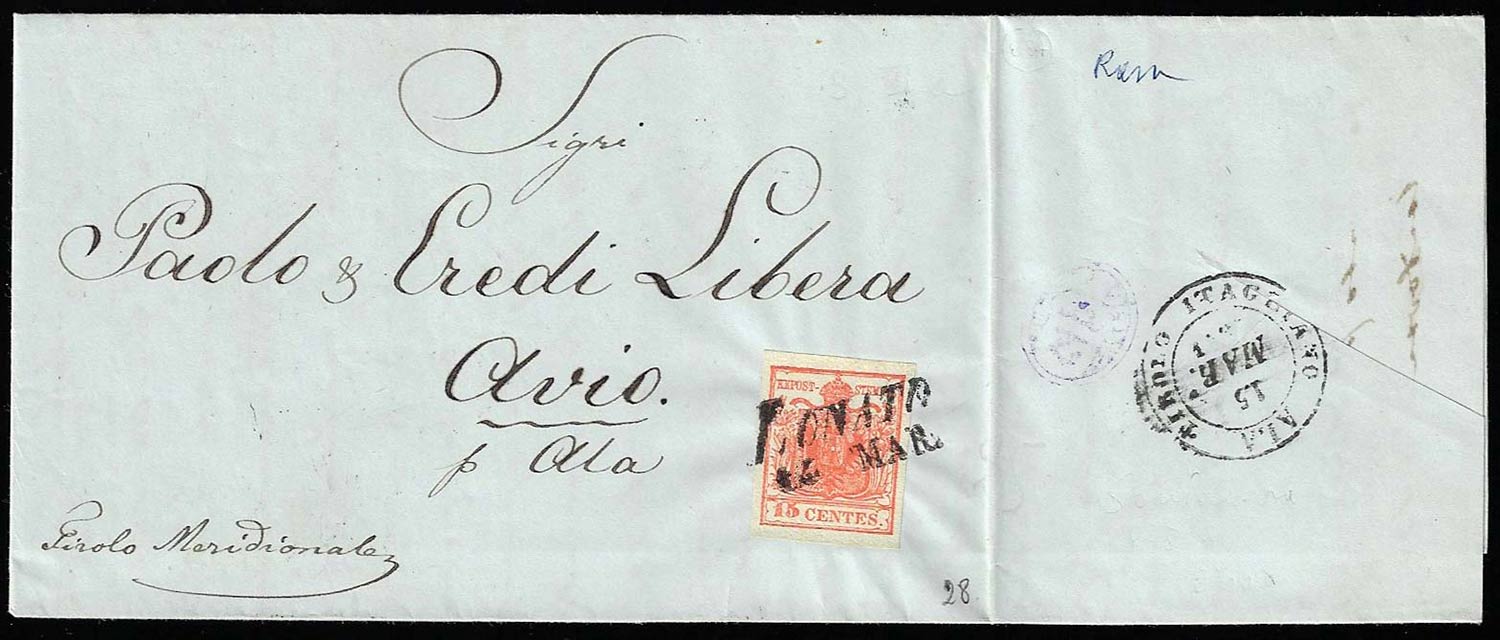 LONATO, SI Ig punti 4 - 15 cent. rosso vermiglio, II tipo (4), perfetto, su lettera del 14/3/1851 per Ala, al verso bollo di arrivo "Tirolo Itagliano".