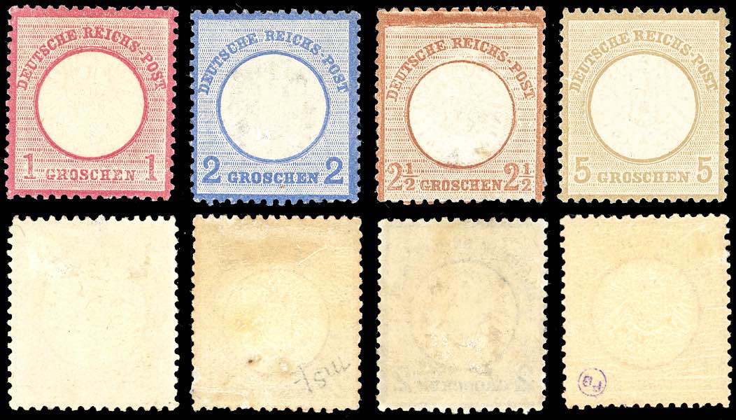 GERMANIA REICH 1872 - 1 g., 2 g., 2 1/2 g., 5 g. Aquila, grande scudo (16/19), gomma originale, perfetti.