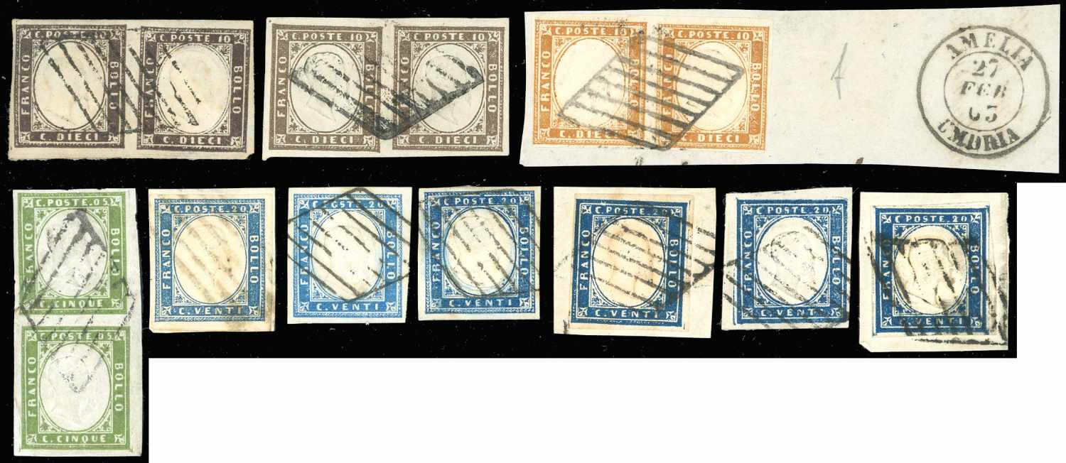 SARDEGNA 1859/1863 - Bell'insieme di francobolli della IV emissione annullati con la griglia pontificia. Buon valore di catalogo.