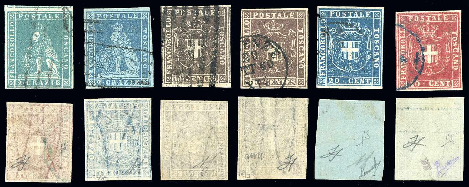 TOSCANA/GOVERNO PROVVISORIO 1851/1860 - Bell'insieme di sei esemplari del periodo usati, tutti perfetti, di ottima qualità e firmati da noti periti.