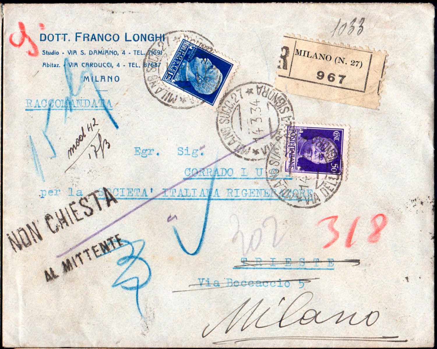 REGNO D'ITALIA 1926/1940 - Sette buste con affrancature di Regno ed una di Repubblica del 1949, tutte rispedite al mittente con vari timbri accessori. Insieme di difficile reperibilità. Ottimo inizio di collezione.