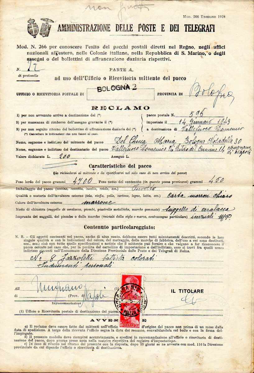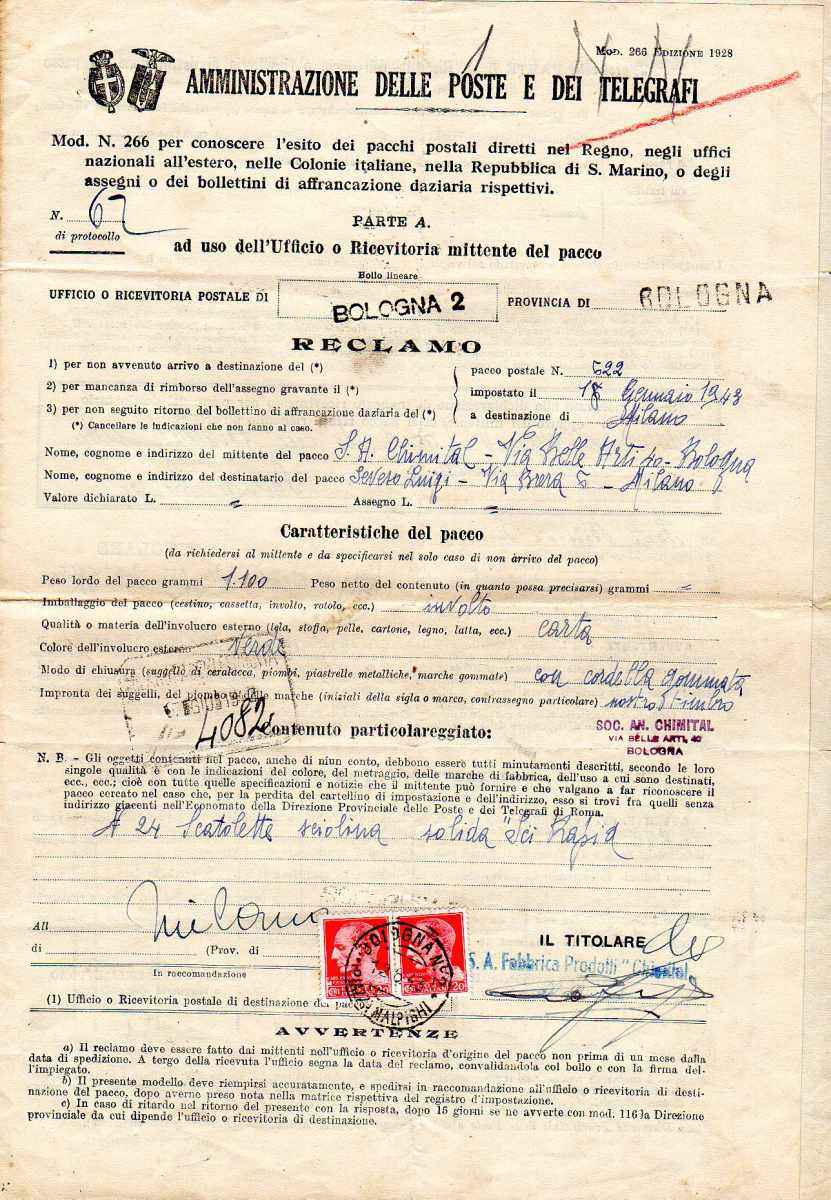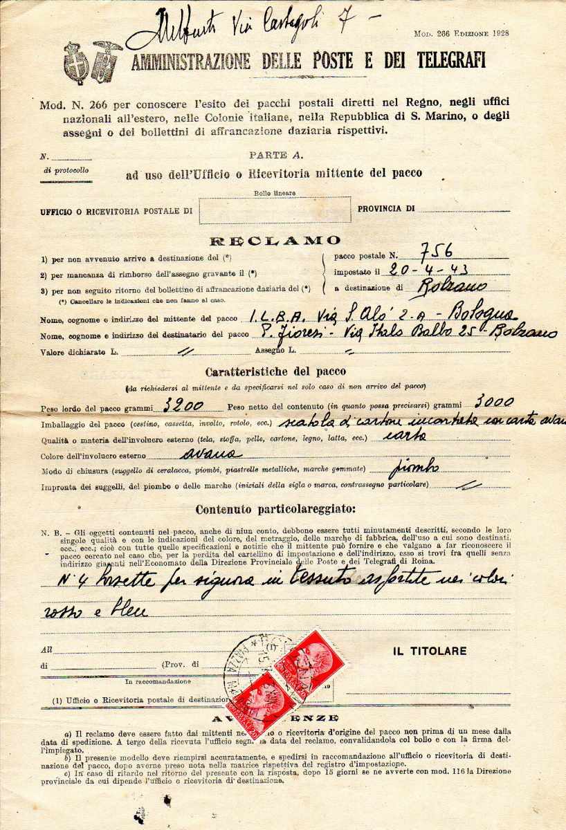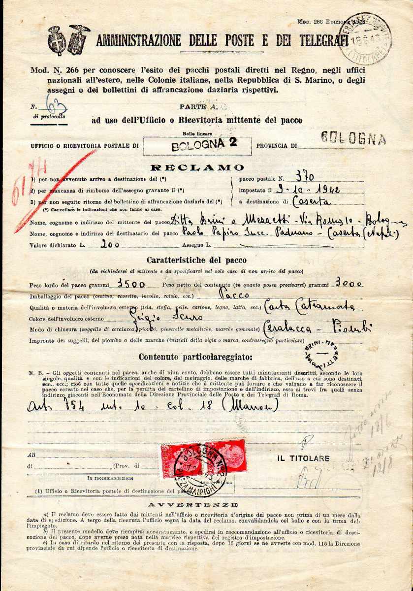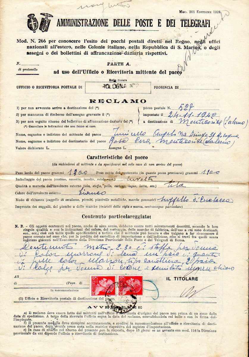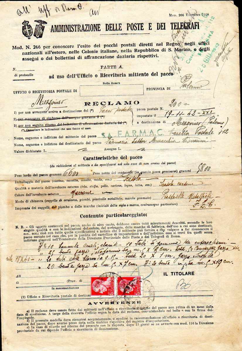 Lotto 3054 - REGNO D'ITALIA 1943 - Quattordici moduli di reclami ...