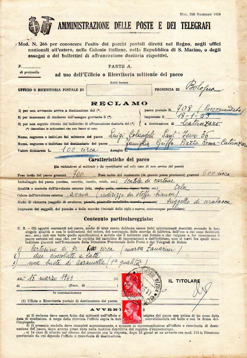 REGNO D'ITALIA 1943 - Quattordici moduli di reclami affrancati con coppia del 20 cent. Imperiale. Non comuni ed interessanti.