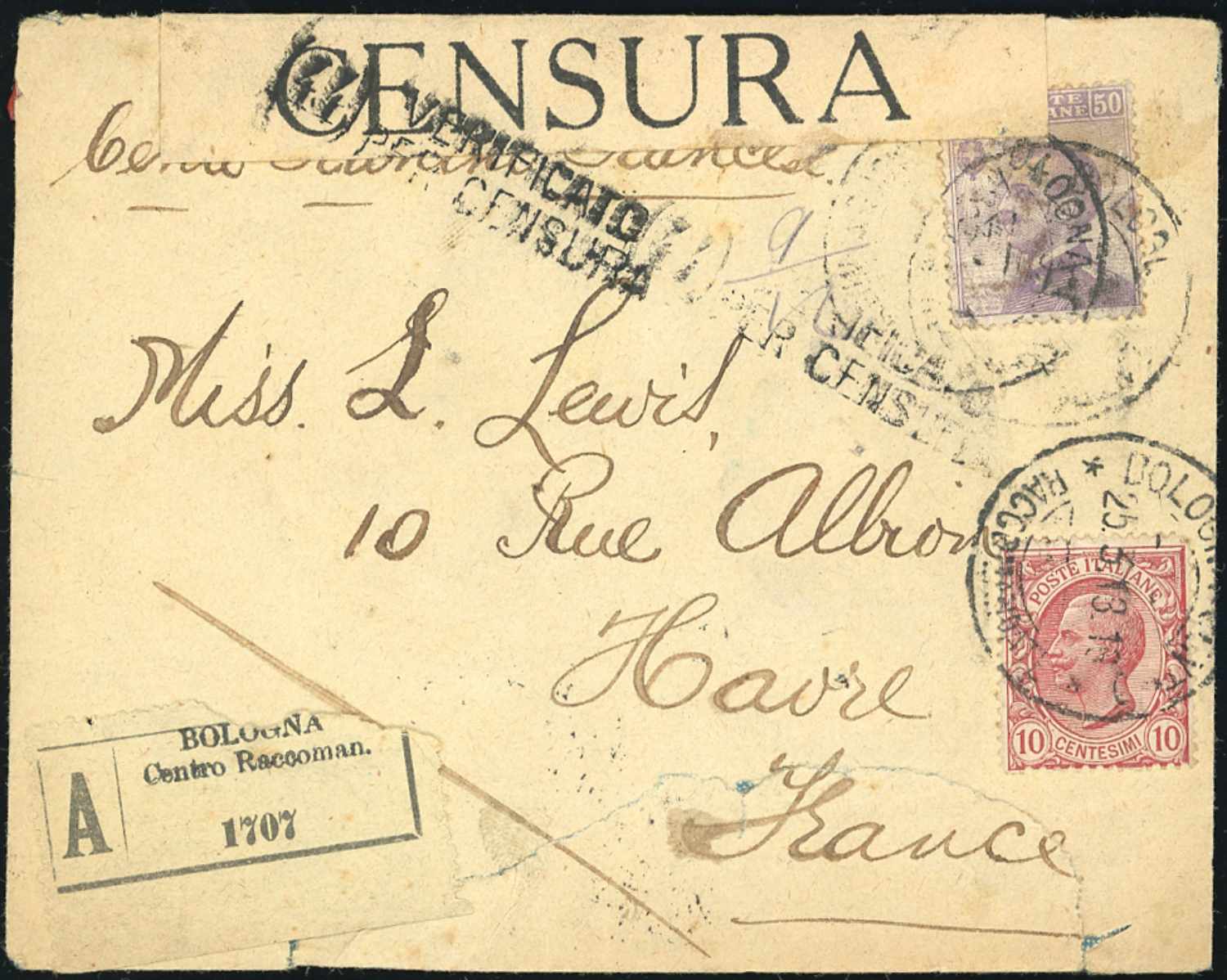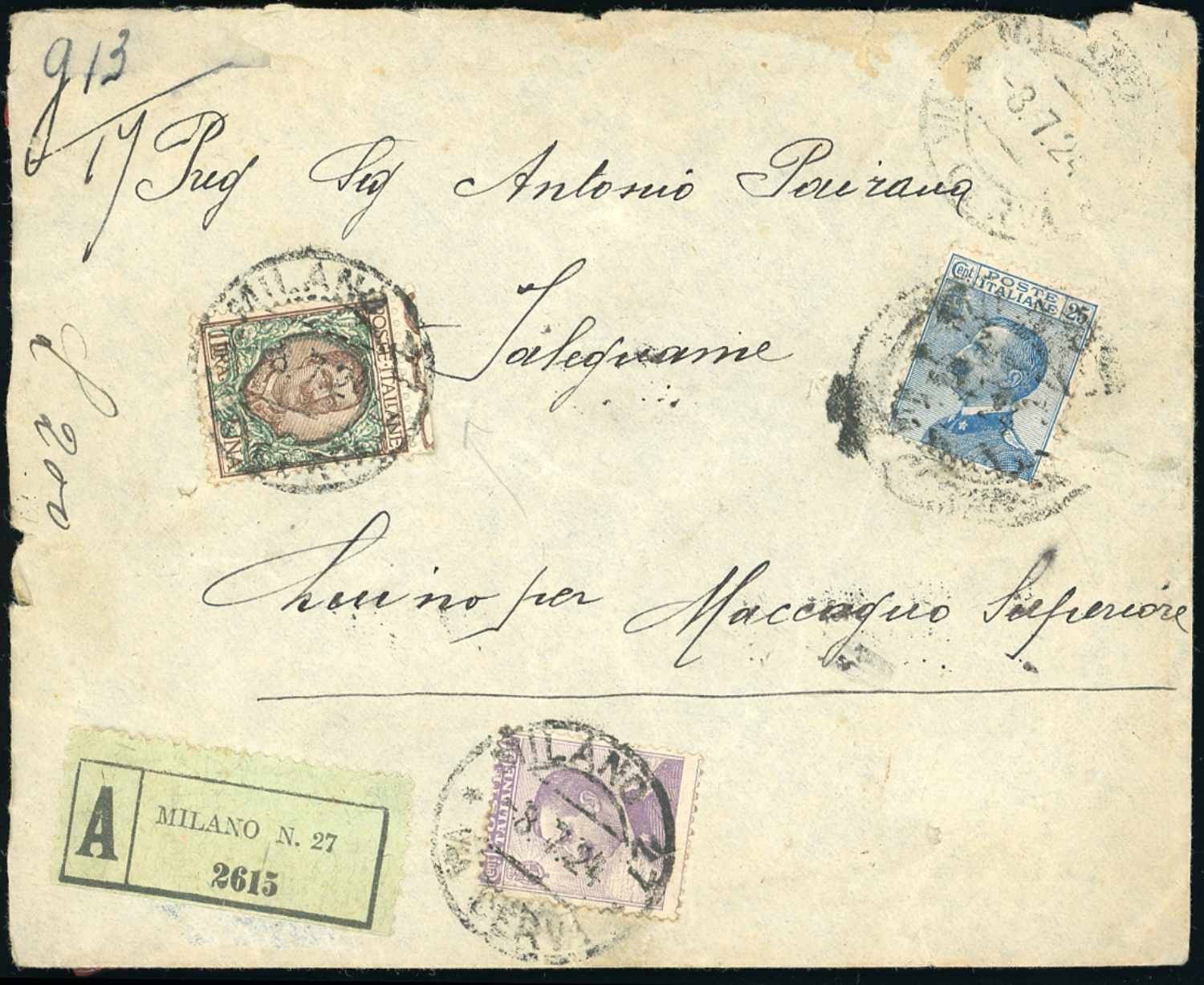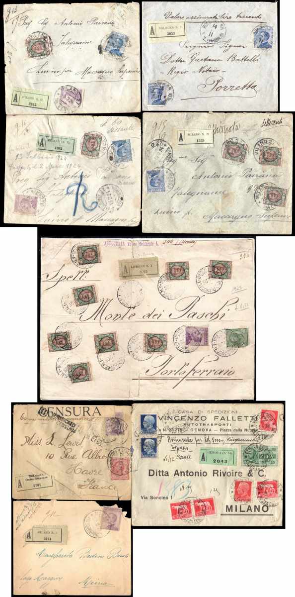 REGNO D'ITALIA ASSICURATE 1911/1932 - Sette buste ed un frontespizio con affrancatura del periodo, di cui una per la Francia. Ottimo inizio di collezione.