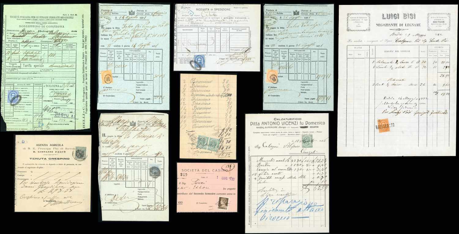 REGNO D'ITALIA USI FISCALI 1870/1930 - Bell'insieme di dieci ricevute varie con francobolli di Vittorio Emanuele II, Umberto I, Vittorio Emanuele III in uso fiscale. Insieme interessante e di difficile reperibilità.