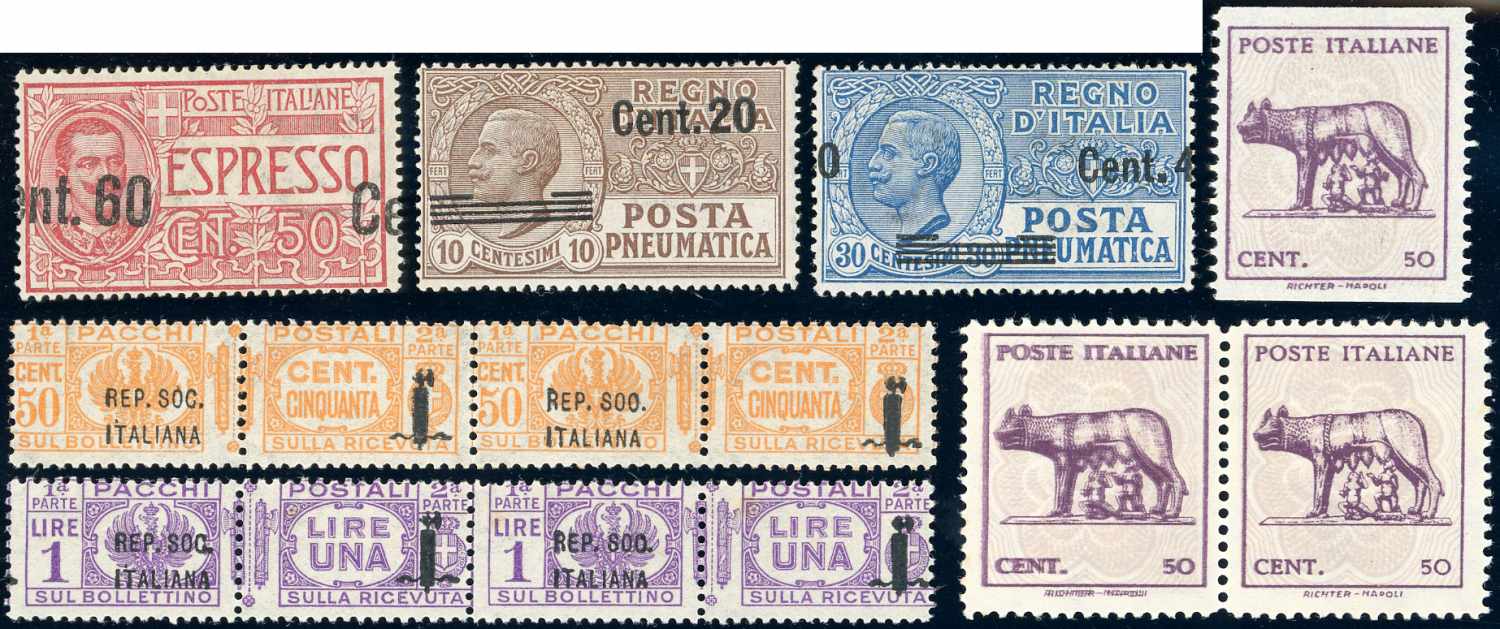 REGNO D'ITALIA/REPUBBLICA SOCIALE ITALIANA/LUOGOTENENZA 1922/1945 - Piccolo insieme di francobolli e servizi del periodo con interessanti varietà.
