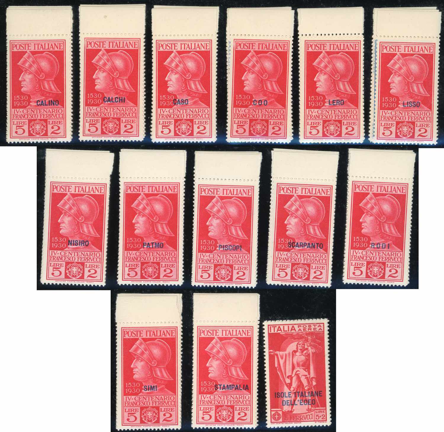 EGEO 1930 - Ferrucci, giri completi delle 13 isole e PA delle emisisoni generali (12/16,A1/3), bordo di foglio, gomma originale integra, perfetti. Belli.