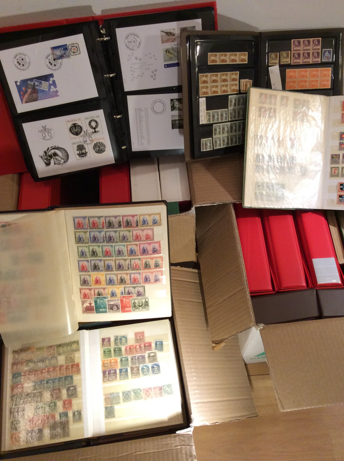 SVIZZERA/MONDIALI 1900/2021 - Otto raccoglitori con FDC di Svizzera dal 1995 al 2021 e diversi classificatori con francobolli di altri Paesi, in tre scatoloni. Divertente.