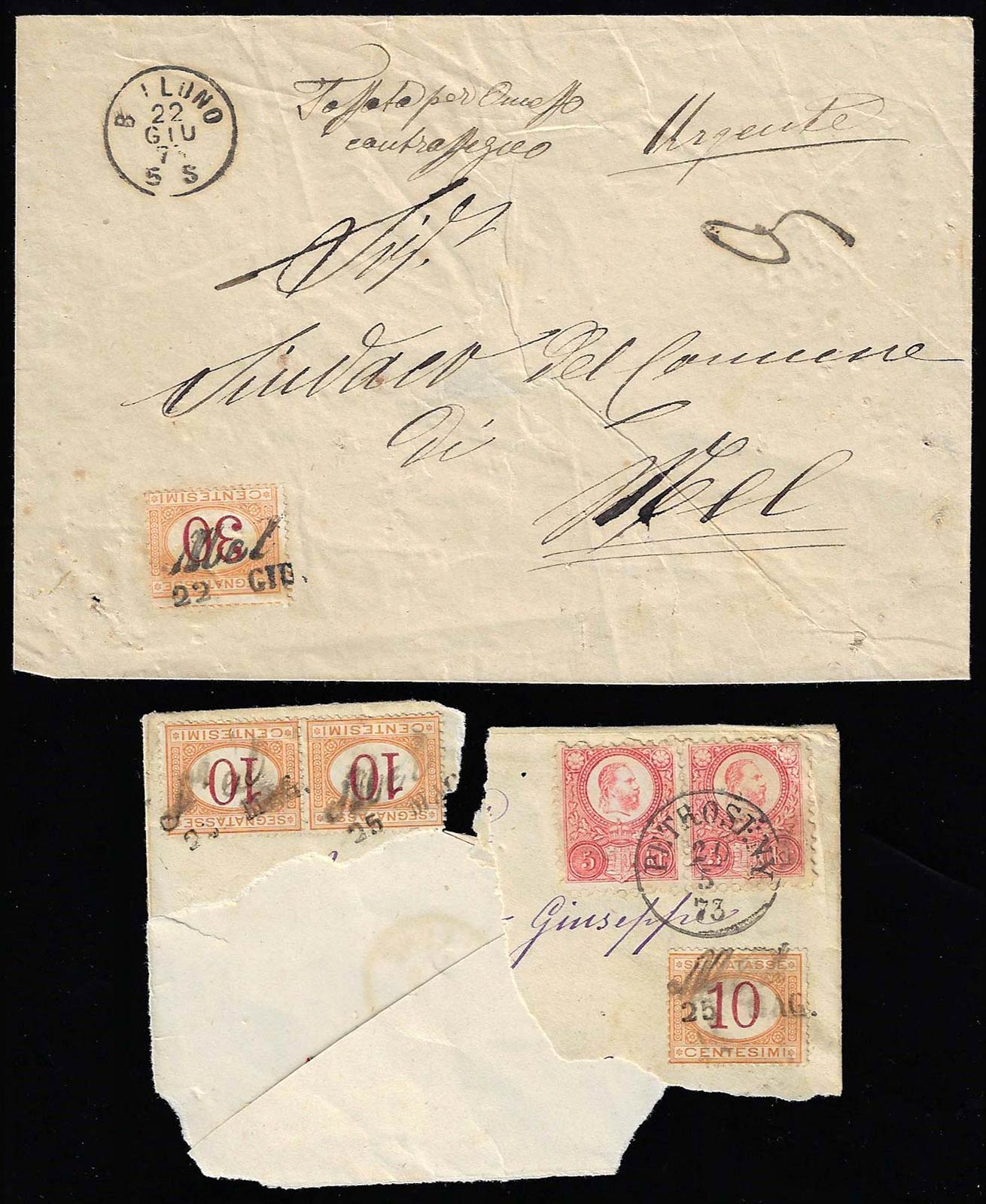 MEL, corsivo - 30 cent. segnatasse (Regno 7), annullato in arrivo su busta non affrancata da Belluno 22/6/1873. Allegati due frammenti, originariamente appartenenti ad un'unica busta con singolo e coppia del segnatasse da 10 cent. (6) con lo stesso annullo.