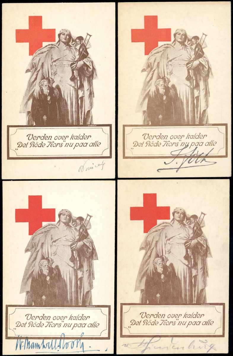 CROCE ROSSA 1922 - Splendido insieme di 4 cartoline nuove, a favore della Croce Rossa danese, autografate rispettivamente da Paul Von Hindenburg, generale e politico tedesco, Bramwell Booth, generale dell'esercito della salvezza (The Salvation Army), Raymond Poincarè, presidente del consiglio della Repubblica Francese, Ferdinand Foch, generale francese. Rare e di ottima qualità.
