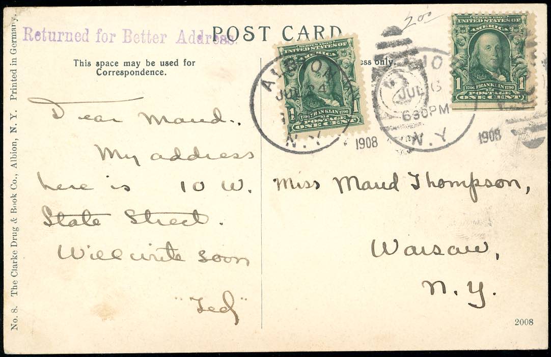 1908 - UNITED STATES OF AMERICA - Returned for letter address with additional franking.