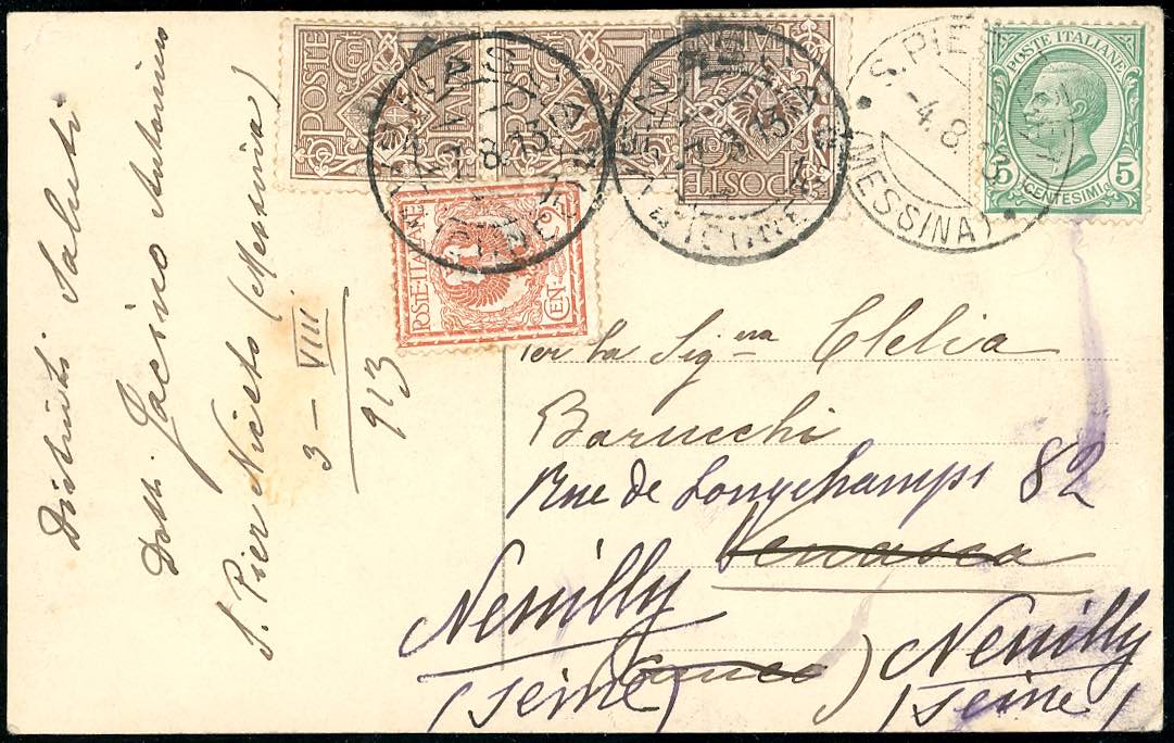 1913 - ITALY/FRANCE - Redirected with additional franking.