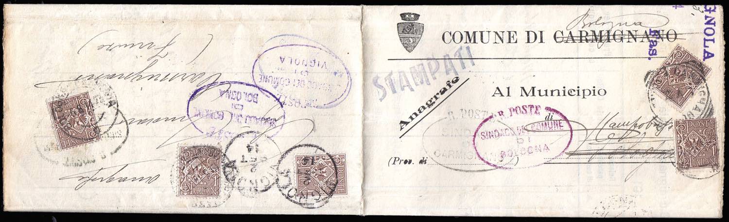 1914 - ITALY - Redirected (four times!) with four additional frankings. Rare, probably unique.