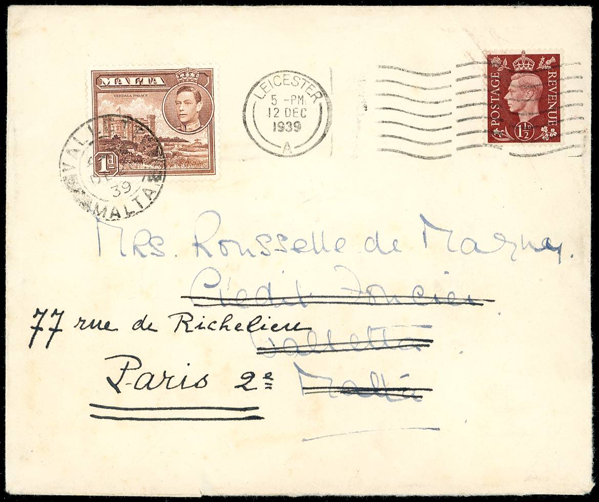 1939 - GREAT BRITAIN/MALTA/FRANCE - Redirected with additional franking.