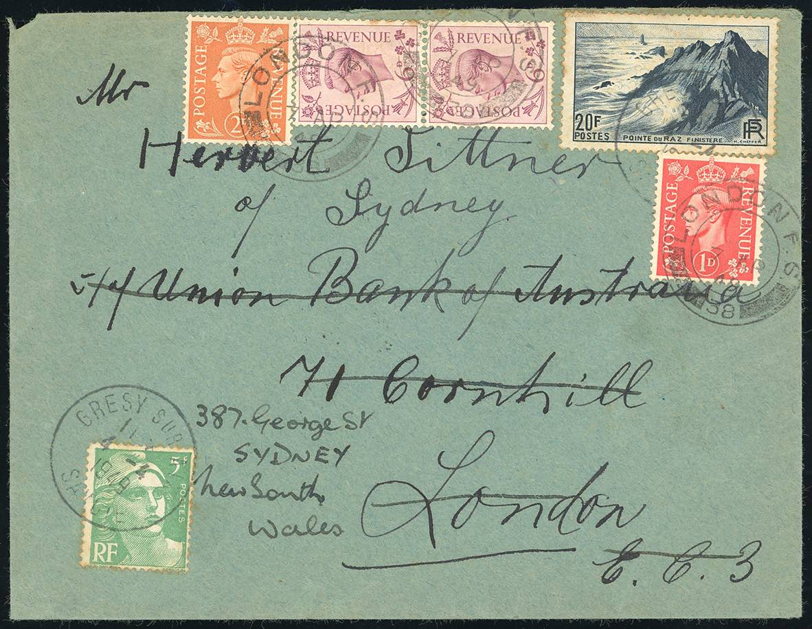 1949 - FRANCE/GREAT BRITAIN/AUSTRALIA - Redirected with additional franking.