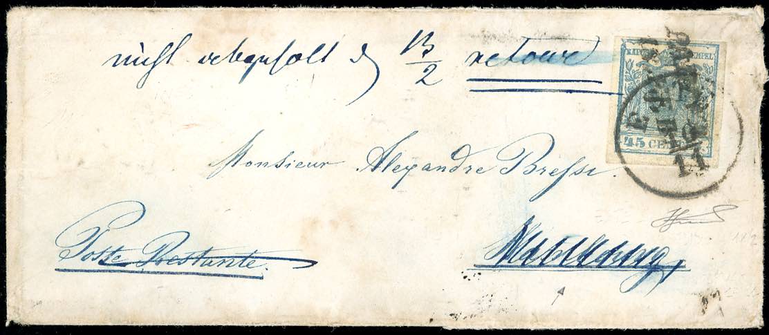 1855 - 45 cent. azzurro, III tipo, carta a mano (12), perfetto, su busta da Este 10/11 ad Hamburg in fermo posta. Non essendo stata ritirata alla posta, il 13/02 - dopo oltre tre mesi, la lettera è stata rispedita al mittente senza ulteriori tassazioni, e il francobollo è stato riannullato a Padova il 18/2. Molto interessante e rara. Ferrario.