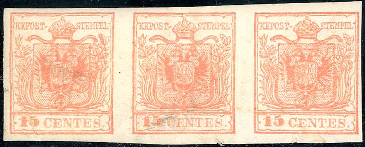 1854 - 15 cent. rosso vermiglio, III tipo, carta a macchina (20), striscia orizzontale di tre, gomma integra, difetti.