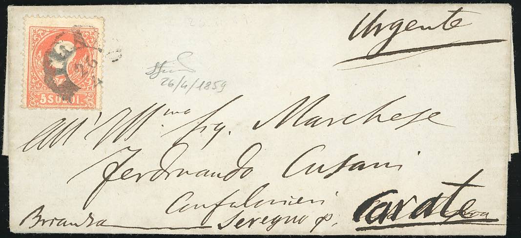 1859 - 5 soldi rosso, II tipo (30) perfetto, su fresca lettera da Milano 26/4/1859 a Carate. Molto interessante in quanto risalente al primo giorno della II guerra d'indipendenza. Ferrario.