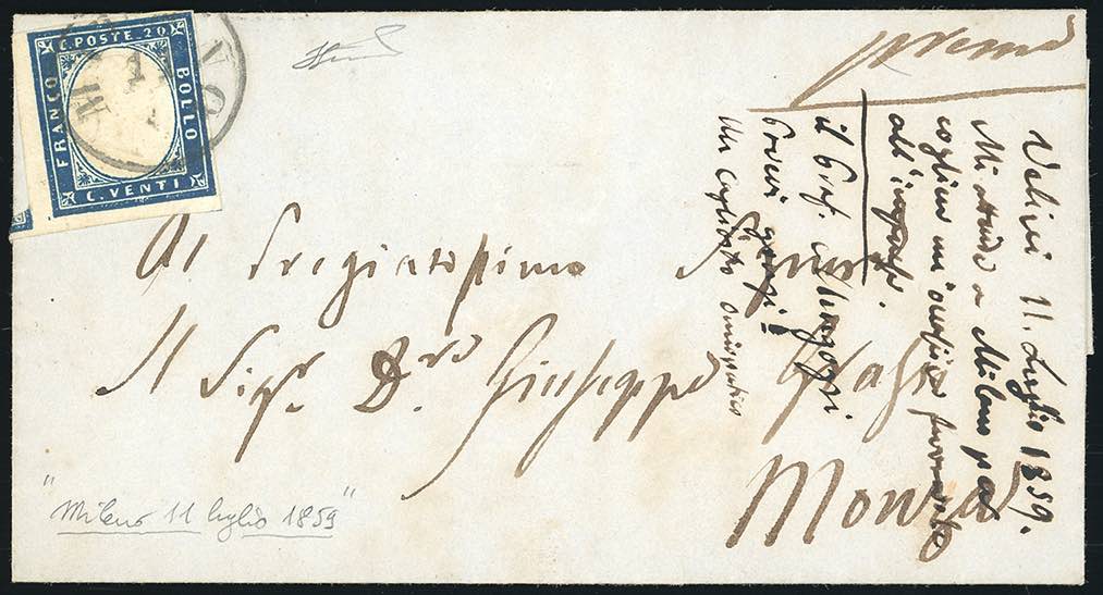1859 - 20 cent. azzurro scuro (Sardegna 15B), perfetto, su lettera da Milano 11/7/1859 a Monza, durante il Governo Provvisorio. Cert. ... Leggi tutto