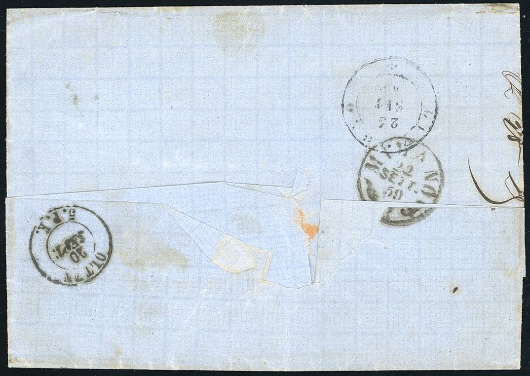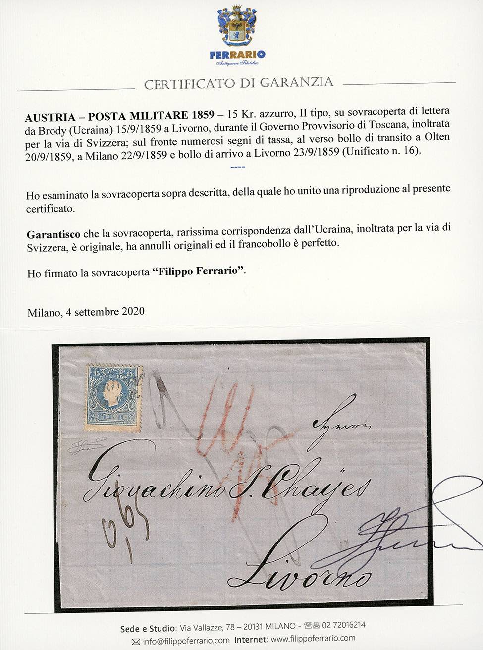 1859 - 15 Kr. azzurro, II tipo (Austria 16), perfetto, su sovracoperta di lettera da Brody 15/9/1859 a Livorno, per la via di Svizzera, con transito di Olten 20/9/1859 al verso e numerosi segni di tassa sul fronte. Rara corrispondenza per la via di Svizzera dall'Ucraina, molto interessante. Cert. Ferrario.