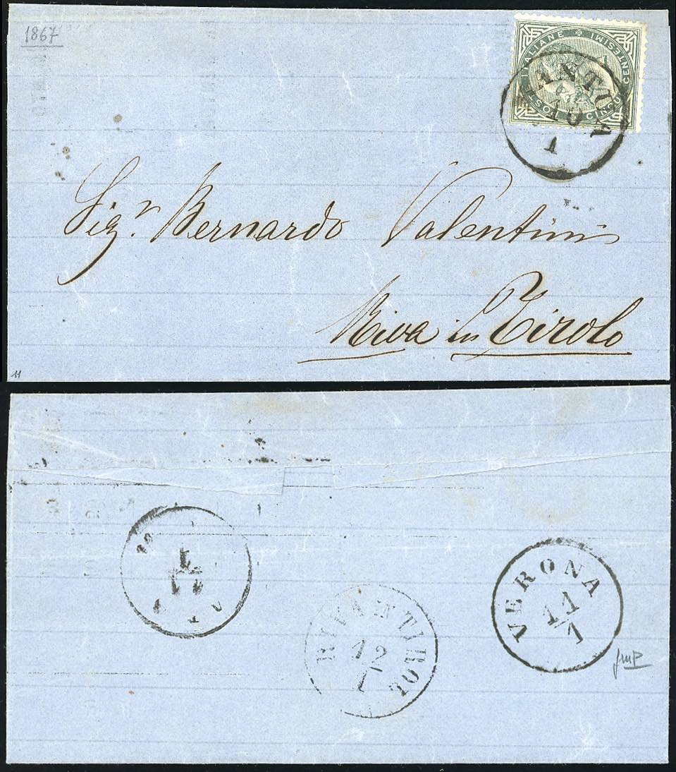 1867 - 5 cent. De La Rue, tiratura di Torino (Regno T16), perfetto, isolato su circolare a stampa da Mantova 10/1/1867, annullo MANTUA, punti 11, a Riva, in Tirolo. Raro stampato per l'estero.