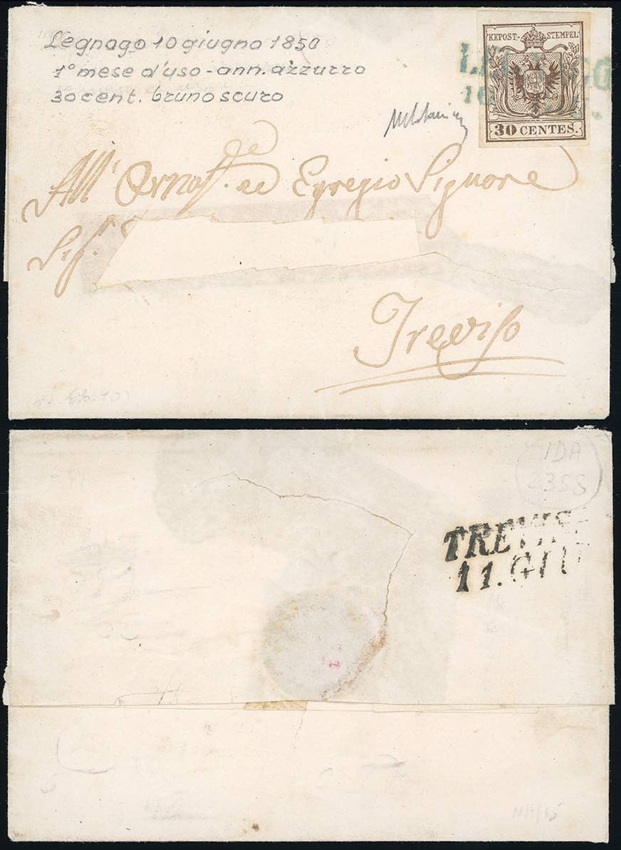 LEGNAGO, SD azzurro punti 12 - 30 cent. (7c), perfetto, su sovracoperta di lettera, indirizzo parzialmente ritagliato, del 10/6/1850, primo mese d'uso, per Treviso. Rara.