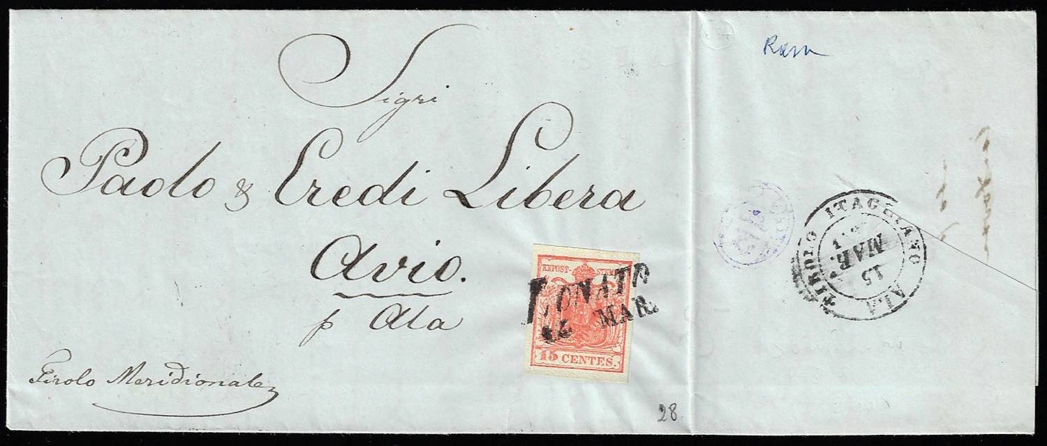 LONATO, SI Ig punti 4 - 15 cent. rosso vermiglio, II tipo (4), perfetto, su lettera del 14/3/1851 per Ala, al verso bollo di arrivo "Tirolo Itagliano".