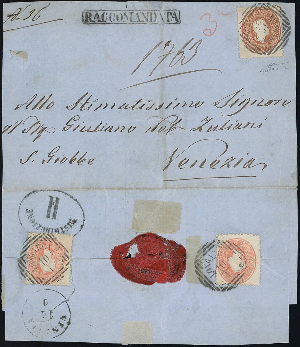 LONGARONE, LOV punti 3 RACC punti 9 - 10 soldi e, al verso, 5 soldi, coppia (33,34), perfetti, su sovracoperta di lettera raccomandata, senza i lembi laterali e superiorI, del 10/1 per Venezia. Ferrario.