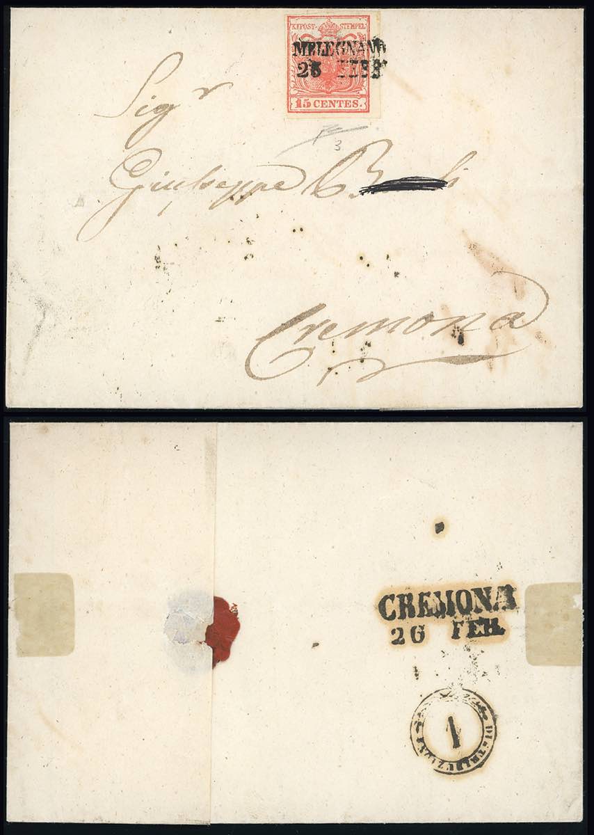 MELEGNANO, SD punti 12 - 15 cent. (3), giusto in un punto a sinistra, su sovracoperta di lettera del 25/2/1851 per Cremona. Molto fresca. R.Diena.