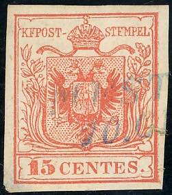 MESTRE, SI azzurro punti R2 - 15 cent. I tiratura (3a), assottigliato e con un piccolo strappo, usato il 10/6/1850. Molto raro. R.Diena.