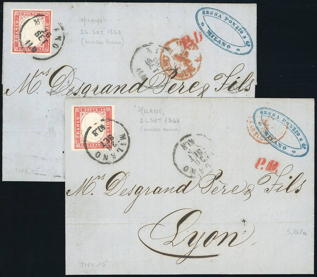 MILANO, cs con ore, tipo 15, senza anno - 40 cent. (Sassone 16Fa), due esemplari, perfetti, su altrettante lettere del 26/9/1863 per Lione. Interessante anomalia dell'annullo, verificatasi probabilmente solo quel giorno!