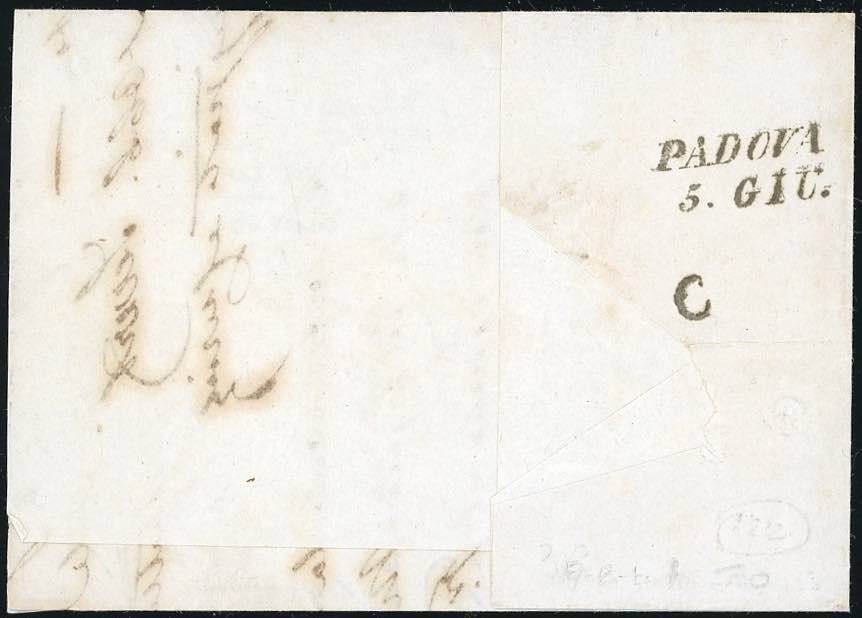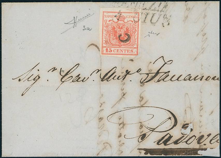 PADOVA, "c" piccolo punti R1 - 15 cent. rosso, I tiratura (3a), perfetto, su lettera, senza il lembo destro, da Venezia 4/6/1850, quarto giorno di emissione, a Padova. Il francobollo venne annullato solo leggermente in partenza, poi riannullato in arrivo dal controllore. Rara! Cert. Sorani e Chiavarello.