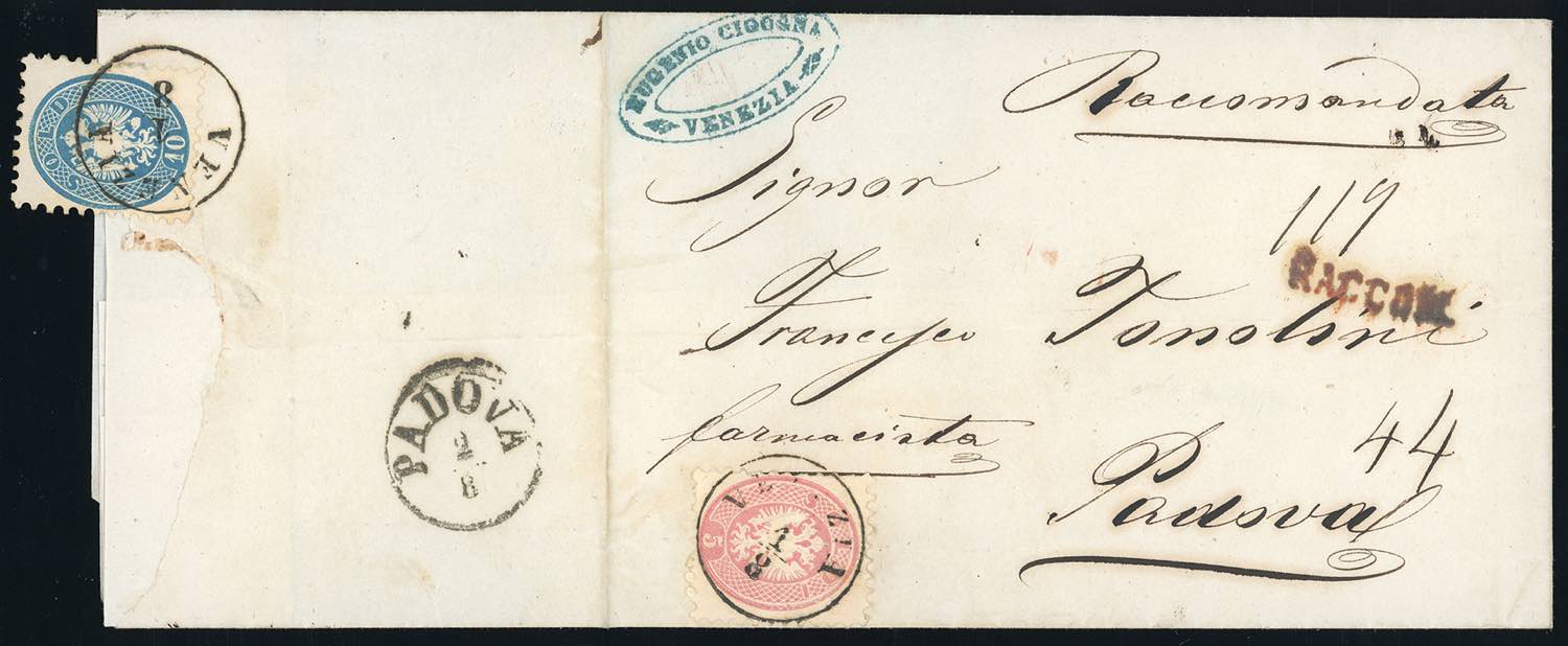 VENEZIA, C1 RACCOM punti 6 - 5 soldi e, al verso, 10 soldi (43,44), perfetti, su sovracoperta di lettera raccomandata del 1/8 per Padova.