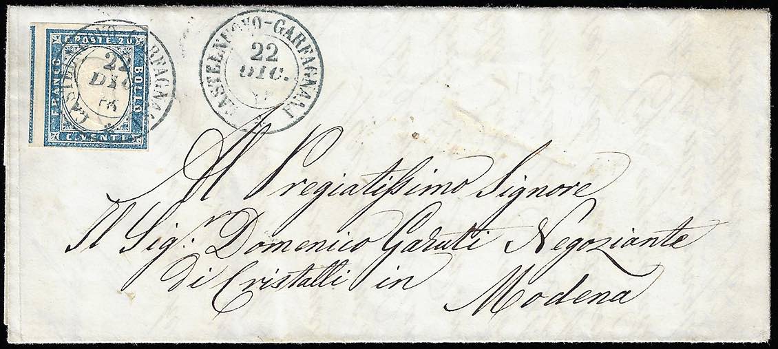 CASTELNUOVO GARFAGNANA, d.c. azzurro punti 11 - 20 cent. (Sardegna 15D), leggermente intaccato a destra, su lettera del 22/12/1861 a Modena. Molto fresca!