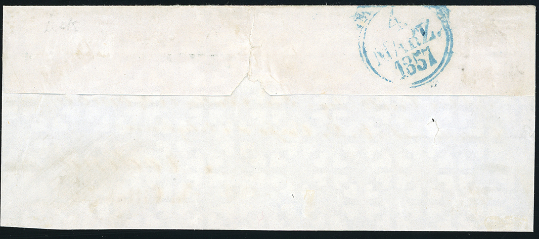 FOSDINOVO, 6 sbarre lineare azzurri punti R1 - 10 cent. (2), giusto a sinistra, su frontespizio completo di lettera con parte del verso, INDIRIZZATA AD UN MILITARE, per Modena, bollo di arrivo 4/3/1857.
