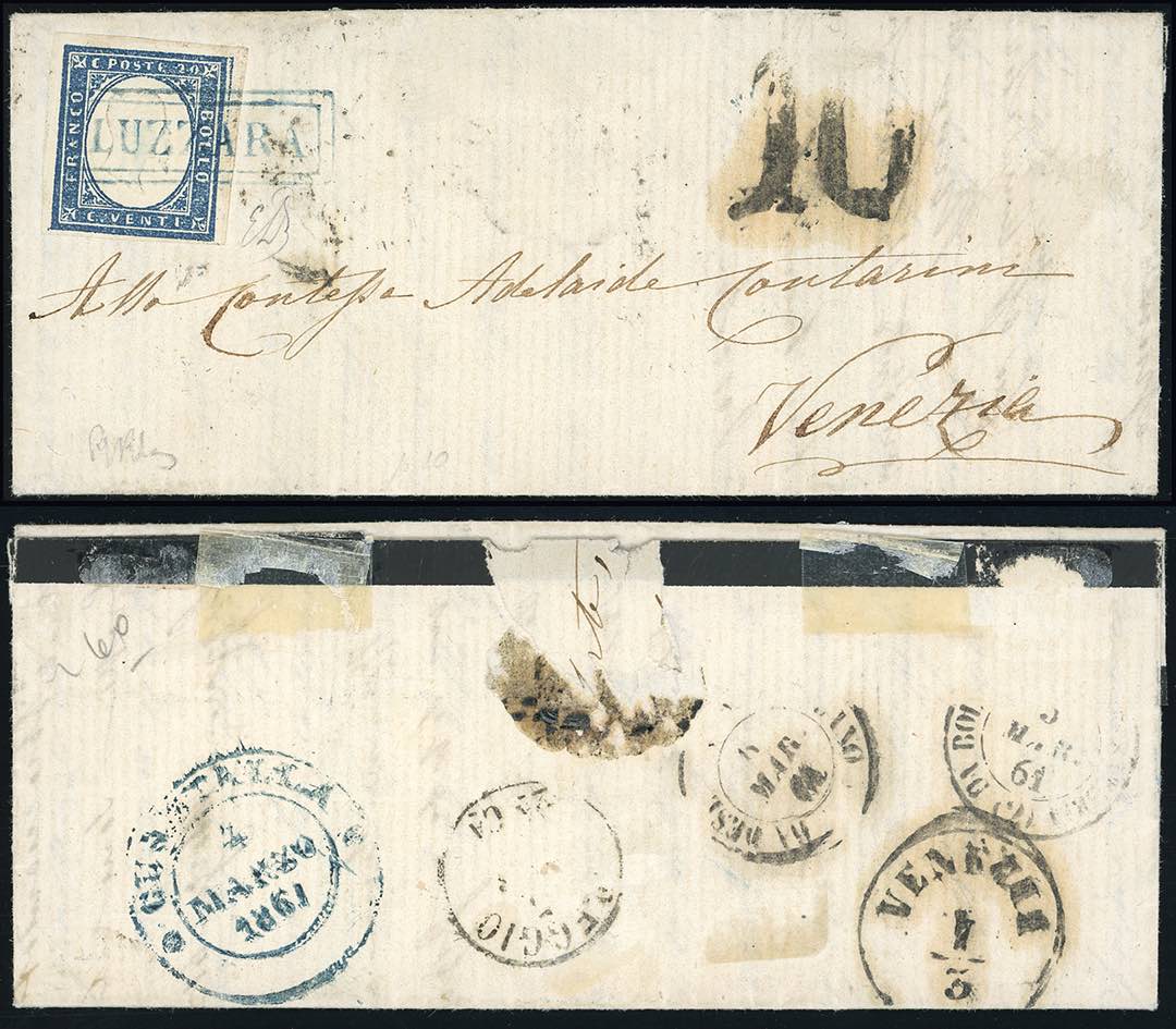 LUZZARA, cartella punti R1 - 20 cent. (15Ca), perfetto, su lettera del 4/3/1861 per Venezia, bollo di tassa 10 soldi. Molto rara! Emilio Diena.