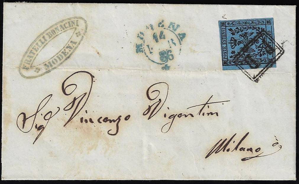 MODENA, PD cerchio punti 8 - 40 cent. (10), perfetto, su sovracoperta di lettera del 14/2/1856 per Milano. Prima data nota per questa combinazione d'annulli.