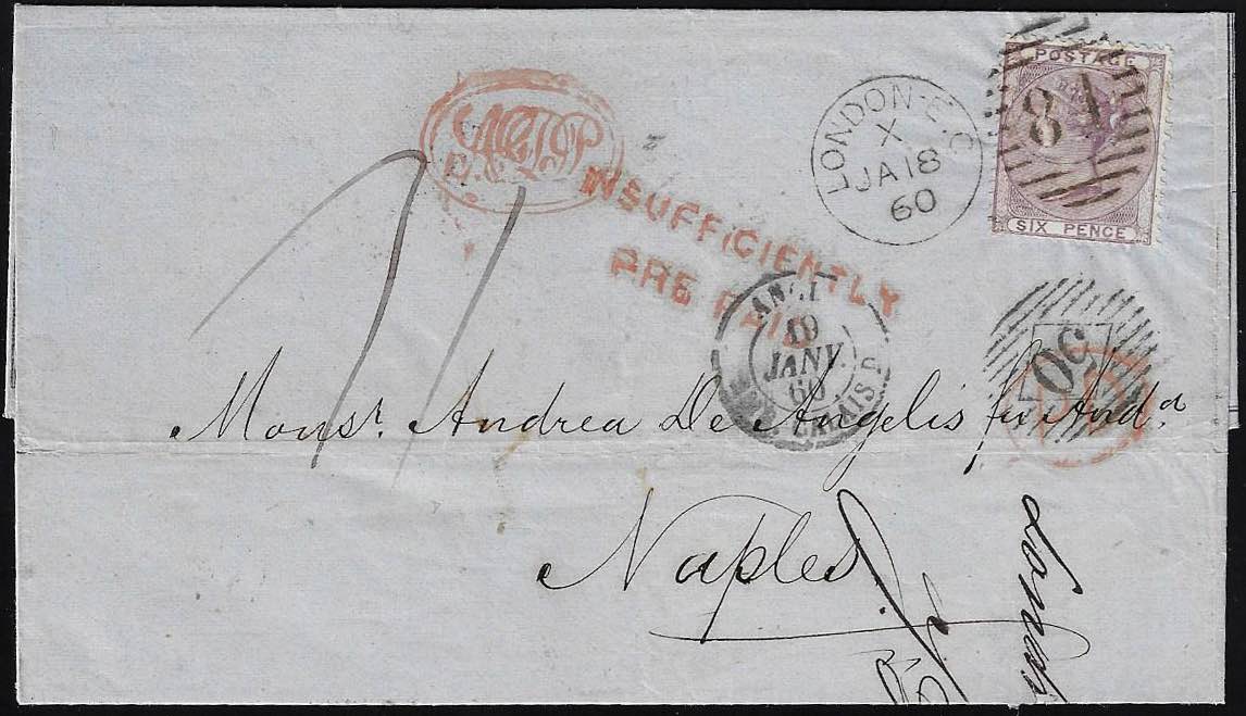 INCOMING MAIL GRAN BRETAGNA 1860 - 6 p. Vittoria (19), ottimo stato, su lettera insufficientemente affrancata da Londra 18/1/1860 a Napoli, tassata 31 grana come lettera non affrancata. Interessante!