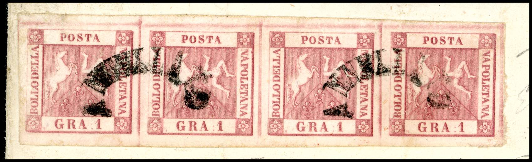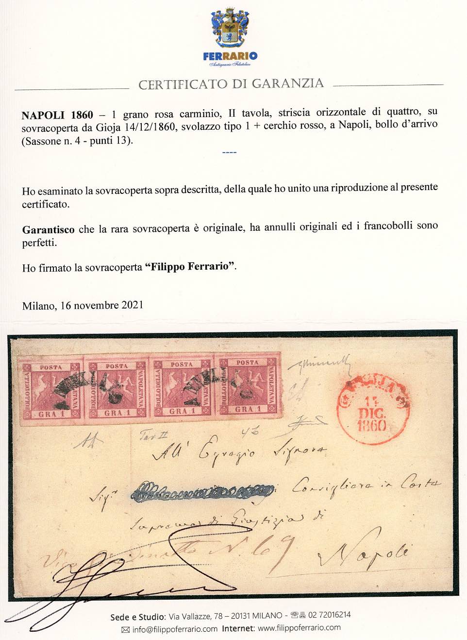 1860 - 1 grano rosa carminio, II tavola (4), striscia orizzontale di quattro, perfetta, su sovracoperta di lettera da Gioja 14/12/1860 (svolazzo tipo 1 cerchio rosso punti 13), a Napoli. Bella e rara! Em. e A.Diena, Chiavarello, cert. Ferrario.