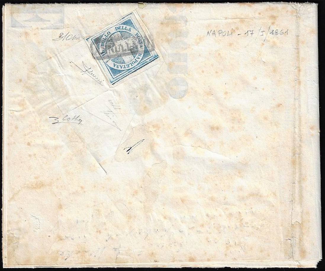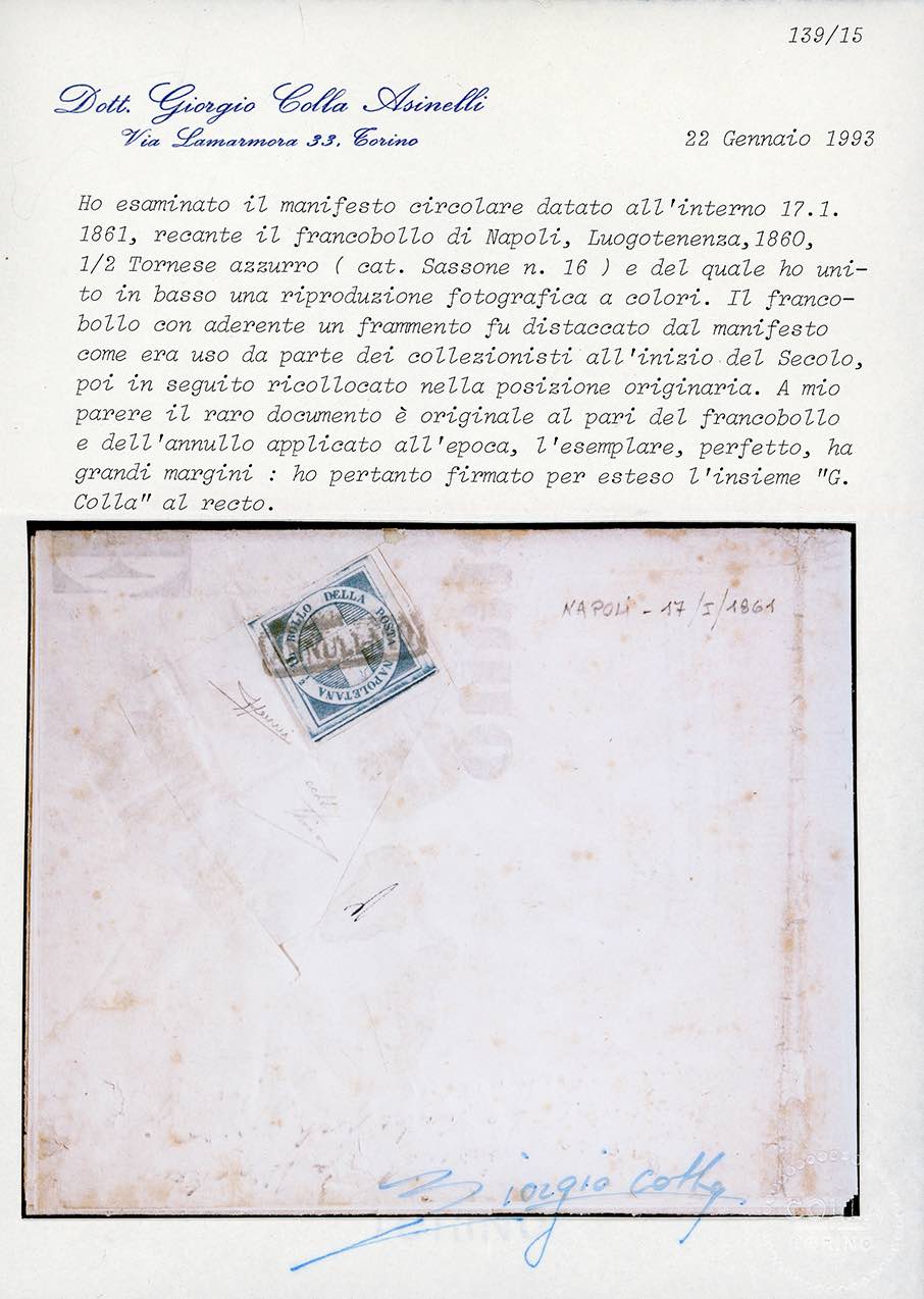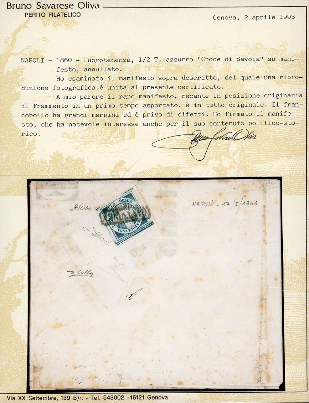 1861 - 1/2 tornese azzurro Crocetta (16), perfetto, usato su manifesto datato internamente Napoli 17/5/1861. Un frammento del manifesto con il francobollo venne ritagliato, come d'uso da parte dei collezionisti di inizi '900, ed è ora ricollocato nella posizione originaria. Raro e francobollo di ottima qualità. A.Bolaffi, E.Diena, cert. Colla e Sorani.
